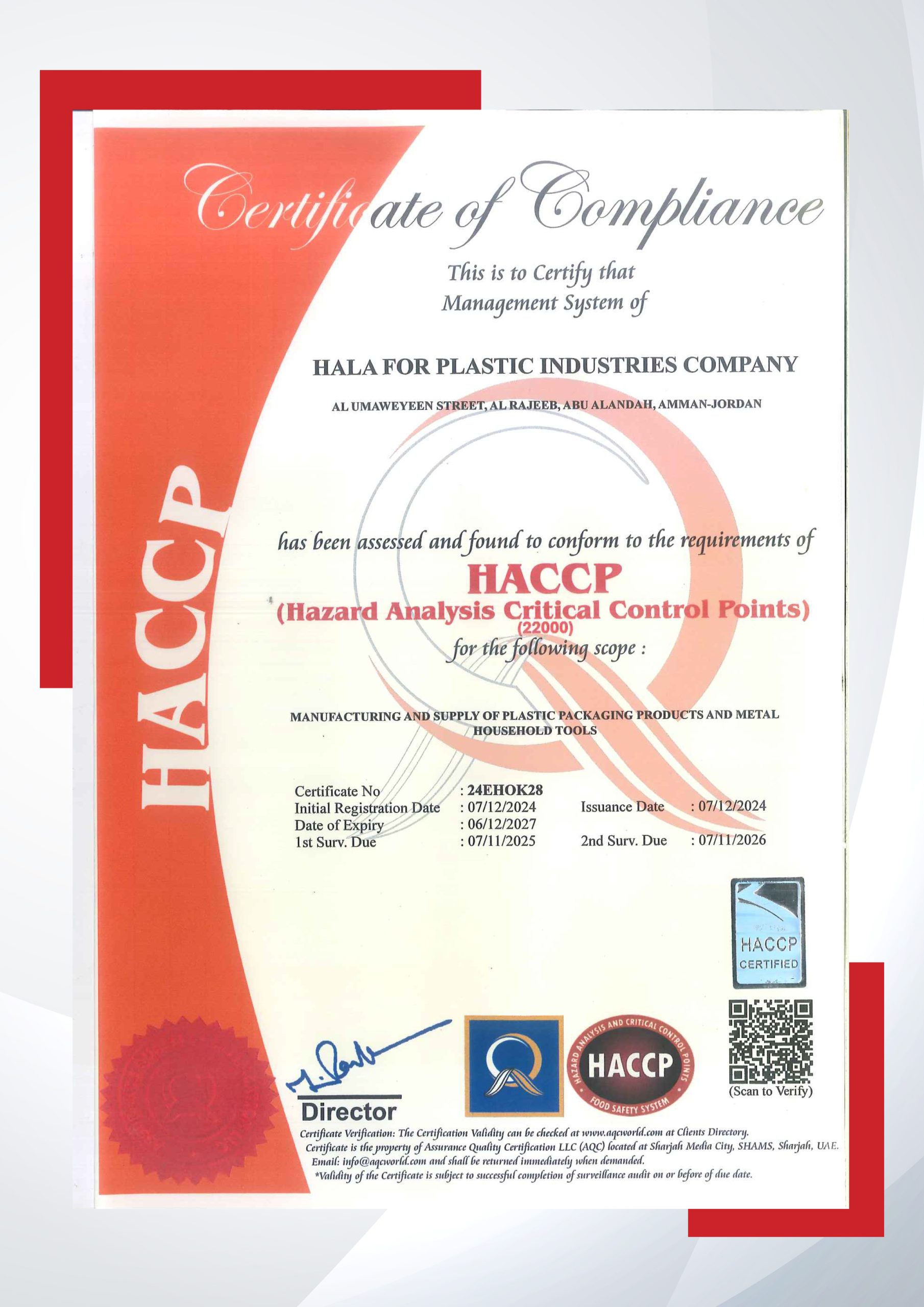 Castle for Packaging & Filling is certified under the HACCP system, a globally recognized standard for ensuring product safety, particularly in food-related industries. This certification confirms our commitment to identifying, evaluating, and controlling potential hazards throughout the manufacturing process, ensuring that our packaging products meet the highest safety and hygiene standards.